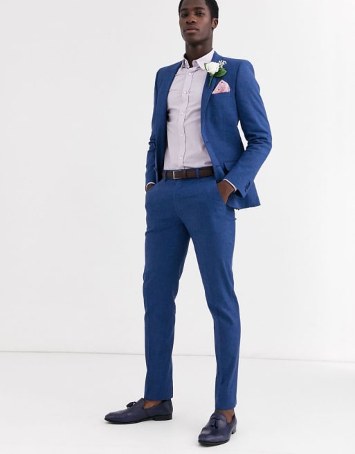 ASOS DESIGN – Bröllop – Blåmelerad kostym i bomulls- och linnemix med smal passform