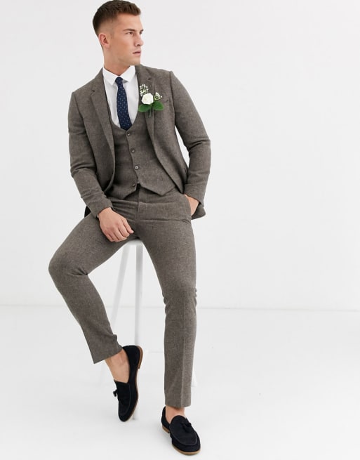 ASOS DESIGN – Bröllop – Brun fiskbensmönstrad kostym i ullblandning med extra smal passform