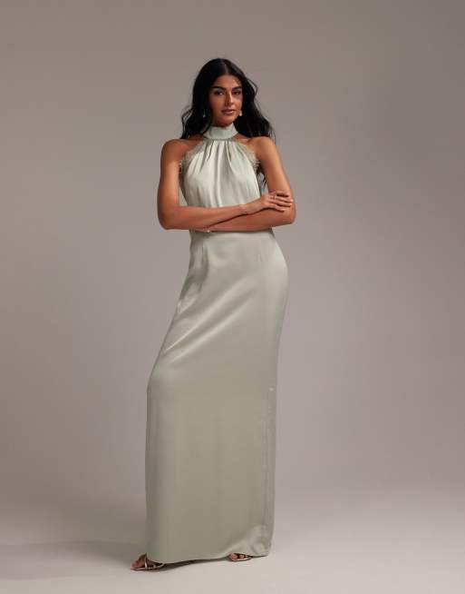 ASOS DESIGN – Brudtärnor – Ljusgrön maxiklänning i satin med spetsdetalj och halterneck