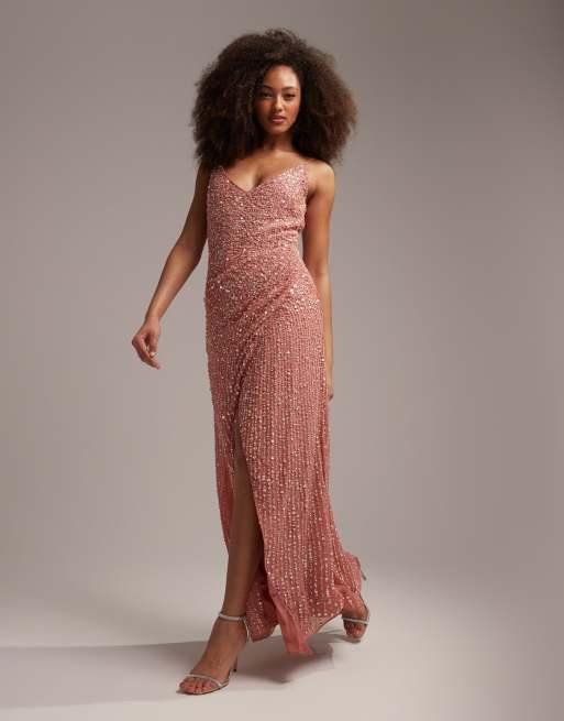 ASOS DESIGN – Brudtärnor – Rosa, utsmyckad maxiklänning med drapering i sidan och smala axelband