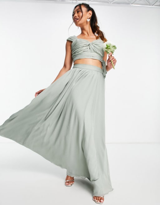 ASOS DESIGN – Brudtärnor – Salviagrönt set med ryschad crop top och mjuk maxikjol