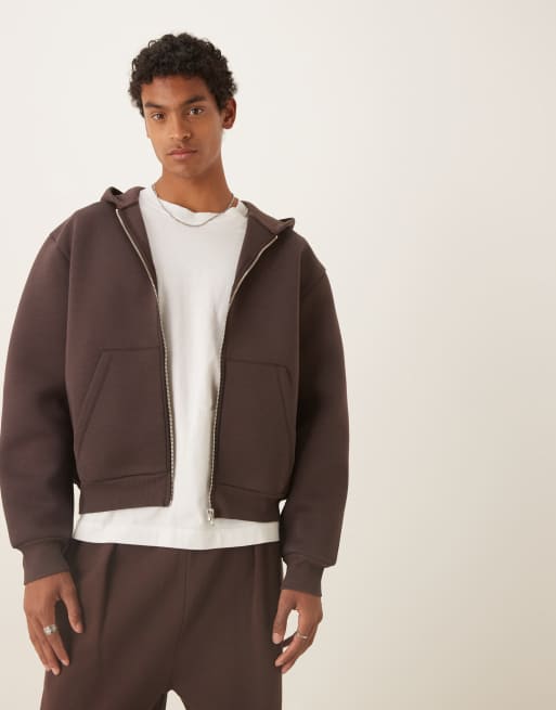 ASOS DESIGN – Brun, avslappnad, kraftig huvtröja med boxig passform och dragkedja i scubaliknande material