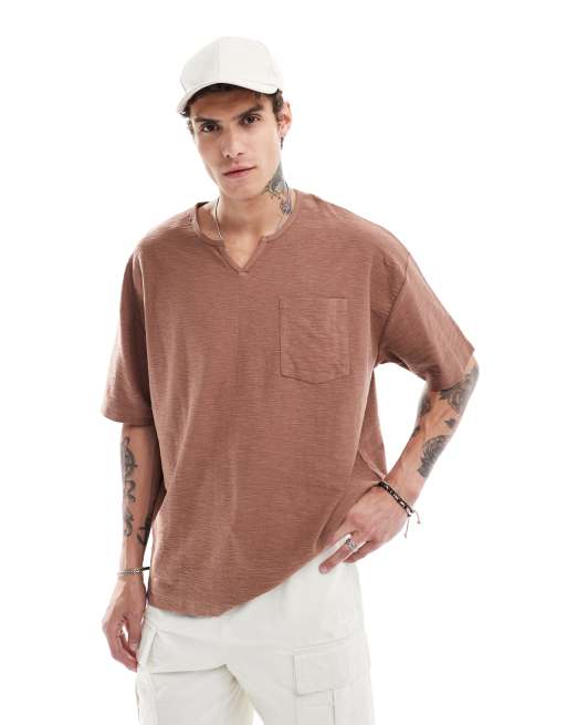 ASOS DESIGN – Brun, avslappnad t-shirt med v-ringning och bröstficka