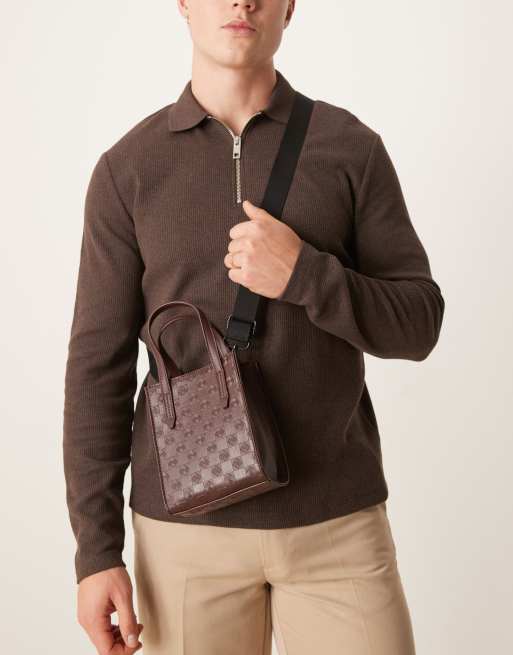 ASOS DESIGN – Brun axelremsväska i läderimitation med monogram