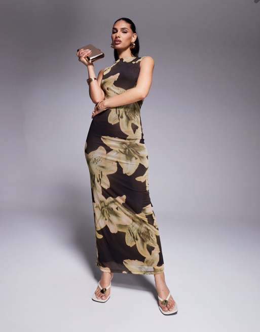 ASOS DESIGN – Brun, blommig maxiklänning i mesh och oversize med rak halsringning