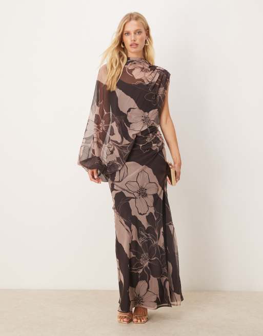 ASOS DESIGN – Brun, blommig maxiklänning med drapering, asymmetrisk design och utskurna detaljer