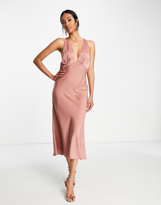 ASOS DESIGN – Brun, diagonalskuren midiklänning med brottarrygg och djup ringning av satin