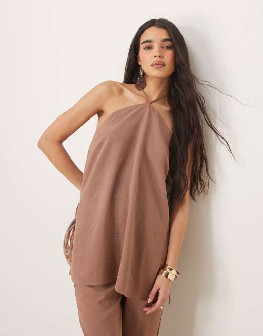 ASOS DESIGN – Brun, figursydd topp med volym och halterneck, del av set