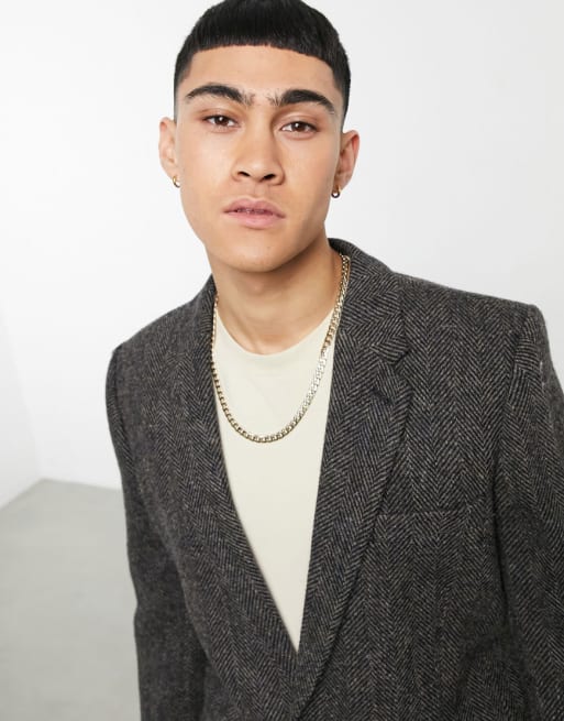 ASOS DESIGN – Brun fiskbensmönstrad kostym i Harris-tweed i 100% ylle och smal passform