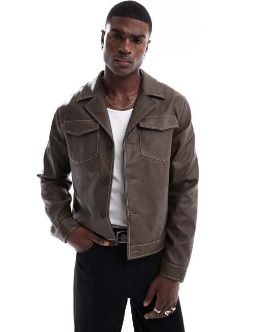 ASOS DESIGN – Brun Harrington-jacka i läderimitation med kontrasterande sömmar
