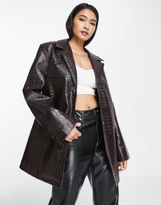 ASOS DESIGN – Brun jacka av läderimitation med mom-design, skärp och krokodilskinnsmönster