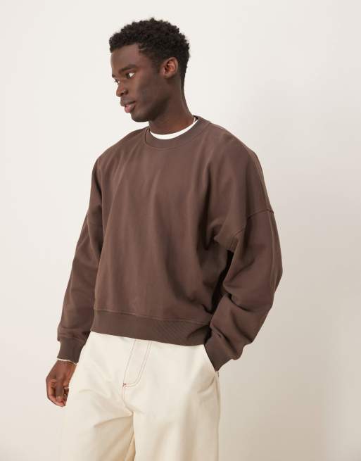 ASOS DESIGN – Brun, kort sweatshirt i oversize med sänkt axelsöm med slitsfåll