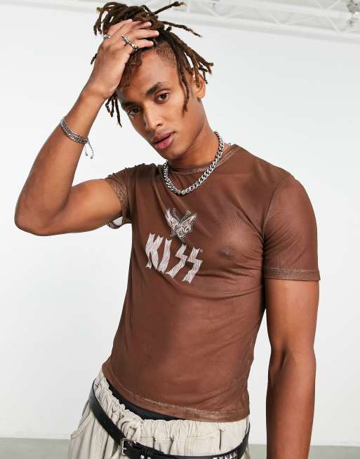 ASOS DESIGN – Brun kort t-shirt i mesh med Kiss-tryck