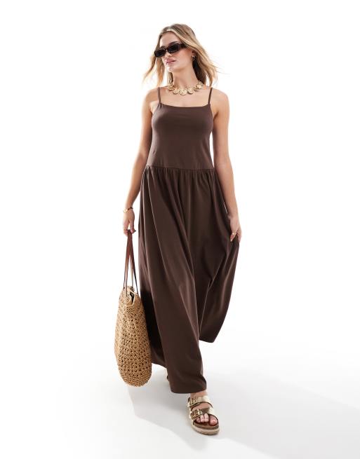 ASOS DESIGN – Brun maxiklänning med smala axelband och vid fåll