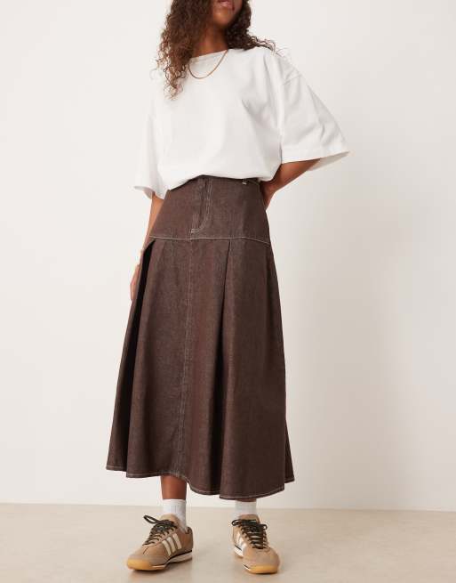ASOS DESIGN – Brun, plisserad, rund jeanskjol med låg midja
