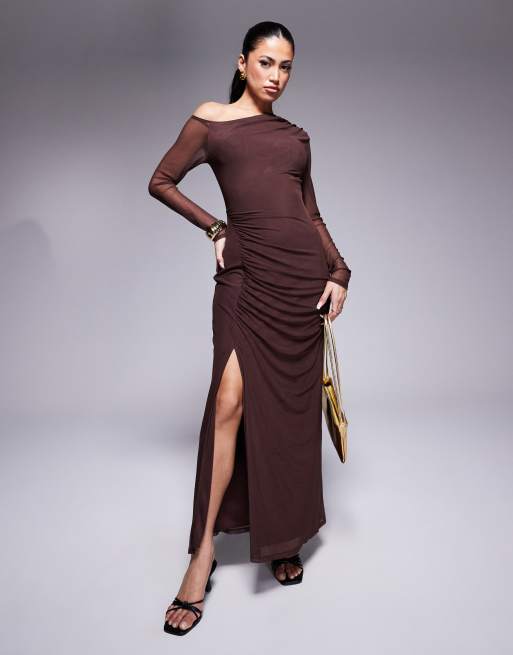 ASOS DESIGN – Brun, rynkad midiklänning i mesh med rak halsringning och långa ärmar