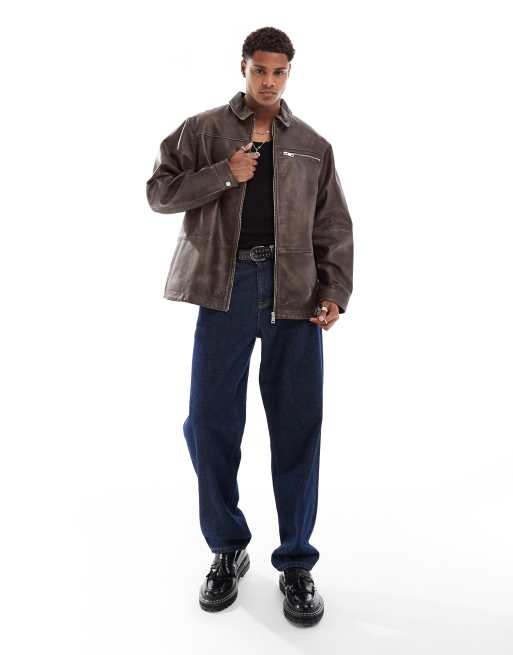 ASOS DESIGN – Brun, sliten Harrington-jacka i äkta läder och oversize