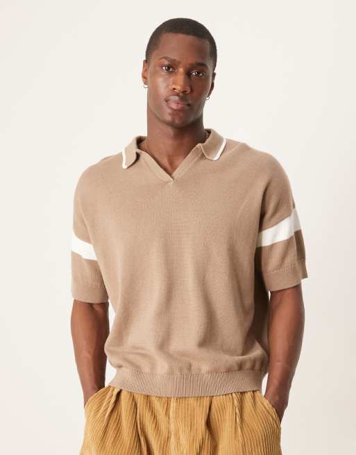 ASOS DESIGN – Brun, stickad, avslappnad och boxig pikétröja med paneler på ärmar och sprund vid halsen