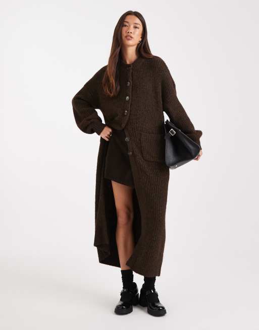 ASOS DESIGN – Brun, stickad kofta i lång modell med rund halsringning