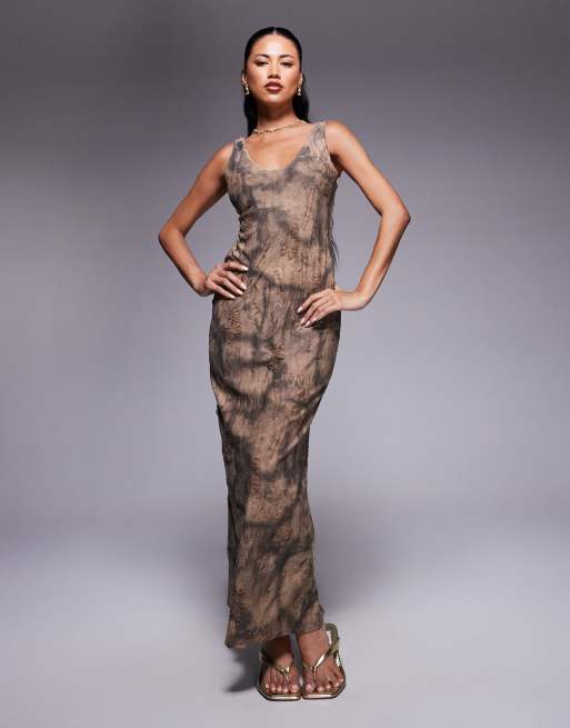 ASOS DESIGN – Brun, strukturerad midiklänning med djup halsringning, glitter, guldfärgade metalldetaljer och abstrakt mönster
