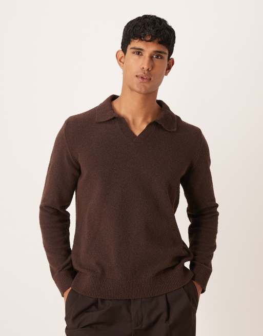 ASOS DESIGN – Brun, strukturstickad pikétröja med avslappnad passform, långa ärmar och sprund i halsen