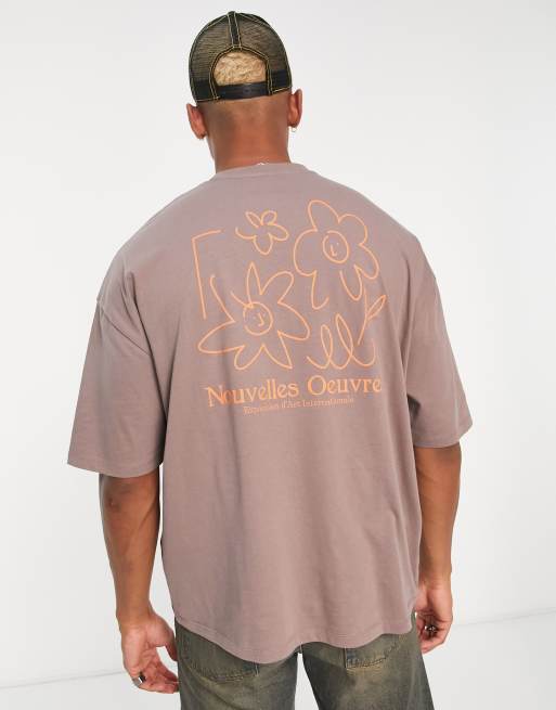 ASOS DESIGN – Brun t-shirt i oversize med blommigt tecknat mönster på ryggen