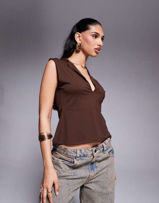 ASOS DESIGN – Brun topp i polyamid med djup ringning och indragen midja