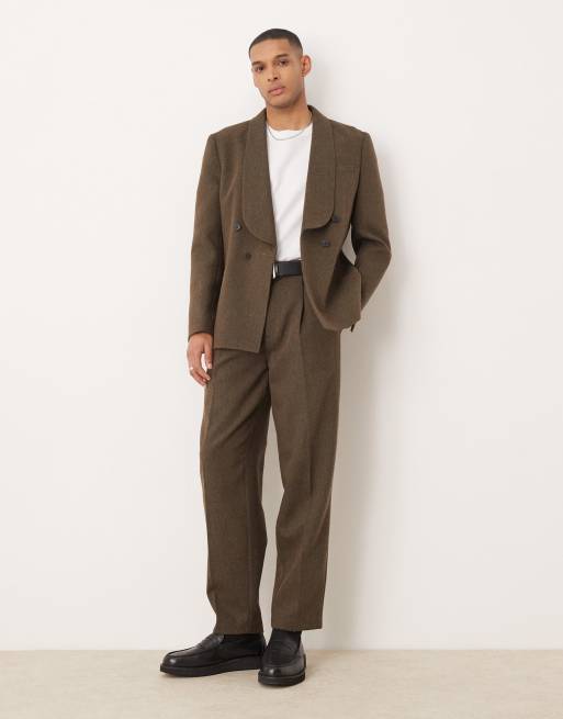 ASOS DESIGN – Bruna, fiskbensmönstrade, avsmalnande kostymbyxor i oversize av ull med veck