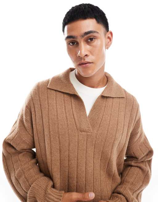 ASOS DESIGN – Brunmelerad, ribbstickad tröja i oversize med notch-krage
