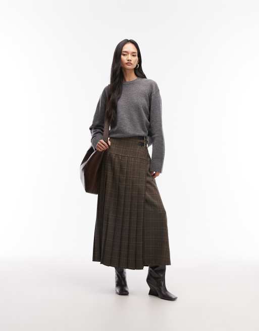 ASOS DESIGN – Brunrutig, plisserad midikjol med spänne