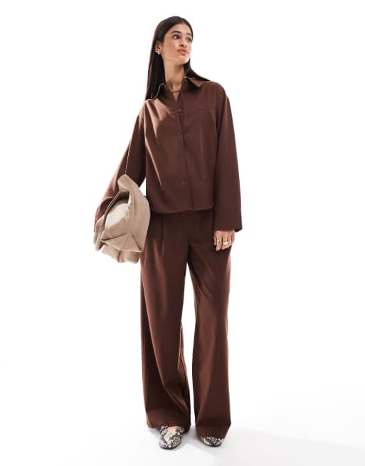 ASOS DESIGN – Brunt set i yllestil med figursydd skjorta och byxor