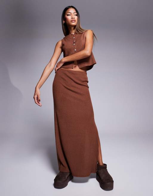 ASOS DESIGN – Brunt set med ribbad kofta i ärmlös design med båtringning och maxikjol