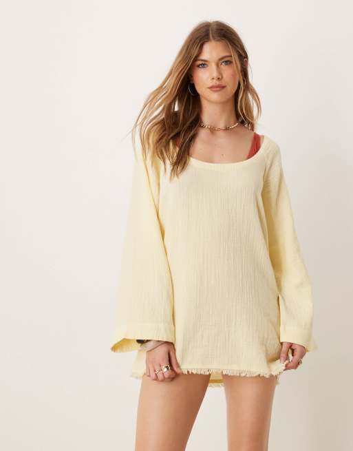 ASOS DESIGN – Callie – Ljusgul, vändbar strandklänning med långa ärmar och fransig fåll i tunn väv