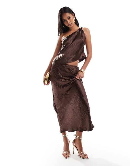 ASOS DESIGN – Chokladbrun diagonalskuren maxikjol i satin, del av set