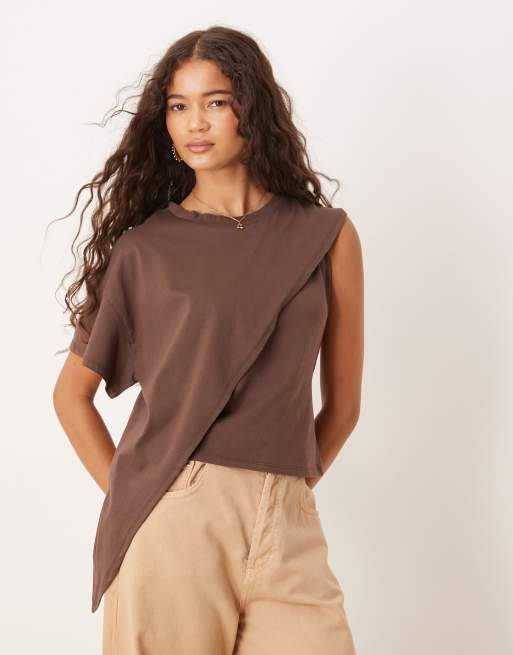 ASOS DESIGN – Chokladbrun, enärmad t-shirt i oversize med draperad detalj