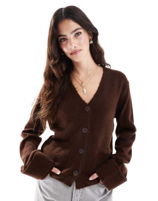 ASOS DESIGN – Chokladbrun, fluffig, stickad kofta med uppvikta muddar