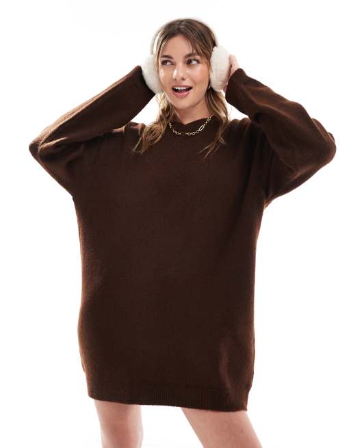 ASOS DESIGN – Chokladbrun, fluffigt stickad klänning med v-ringning