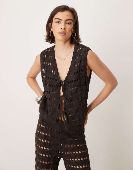 ASOS DESIGN – Chokladbrun, hålstickad och virkad kostymväst med knytning framtill
