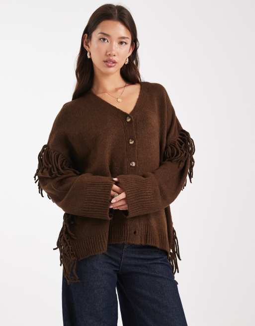 ASOS DESIGN – Chokladbrun kofta i boyfriend-modell med fransar