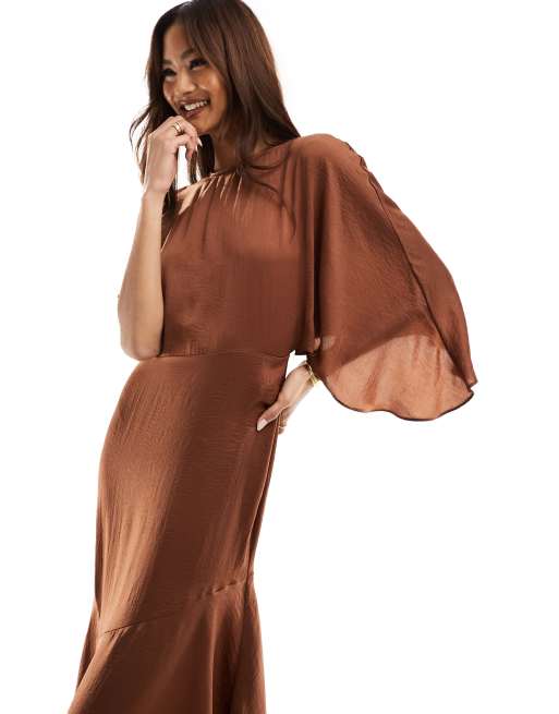 ASOS DESIGN – Chokladbrun midiklänning i satin med utsvängda ärmar och asymmetrisk fåll