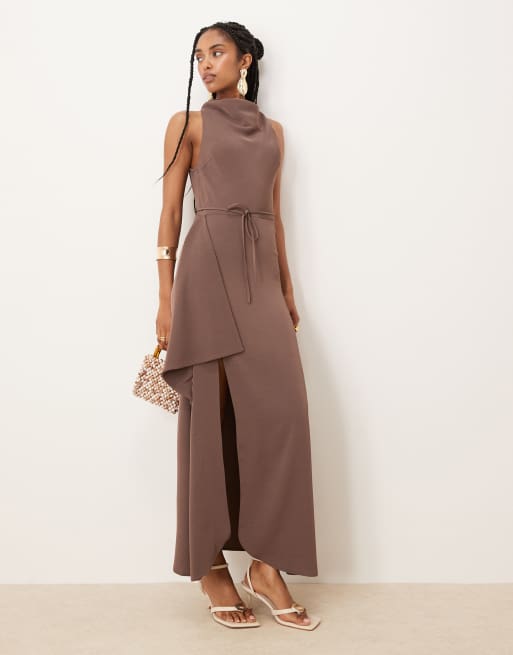 ASOS DESIGN – Chokladbrun midiklänning med hög krage och draperad kjol