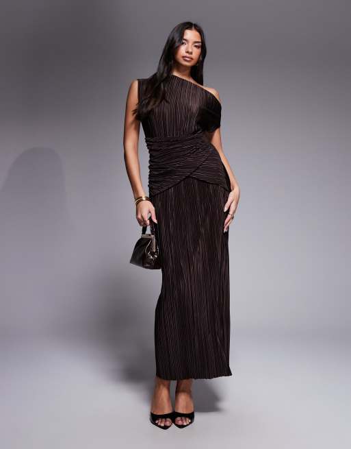 ASOS DESIGN – Chokladbrun, plisserad fodralklänning i maxilängd med sänkt axel och snurrad detalj i midjan