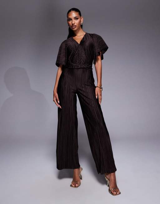 ASOS DESIGN – Chokladbrun, plisserad jumpsuit med korta ärmar, djup ringning och omlottdesign i midjan