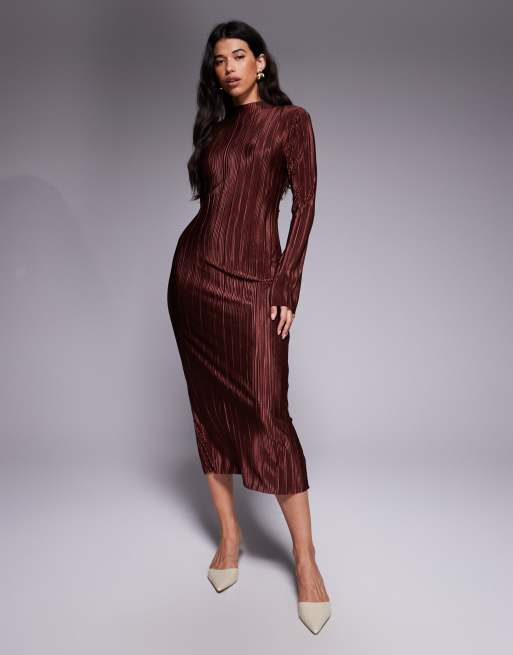 ASOS DESIGN – Chokladbrun, plisserad klänning med långa ärmar och knytning baktill