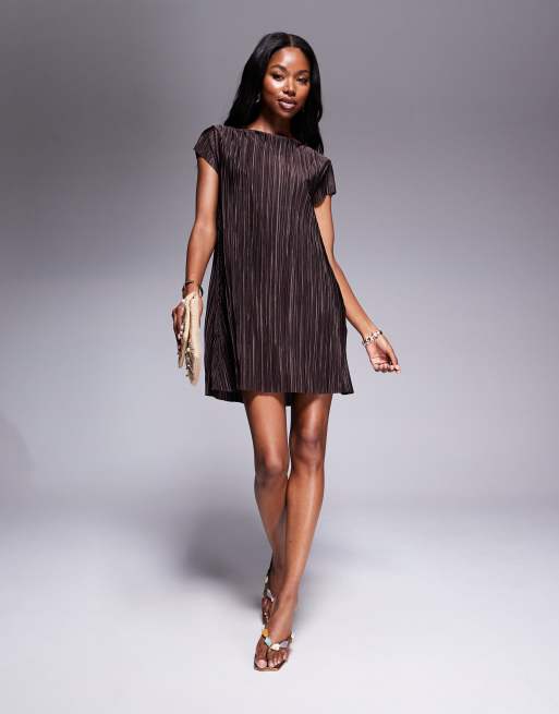 ASOS DESIGN – Chokladbrun, plisserad miniklänning med holkärmar