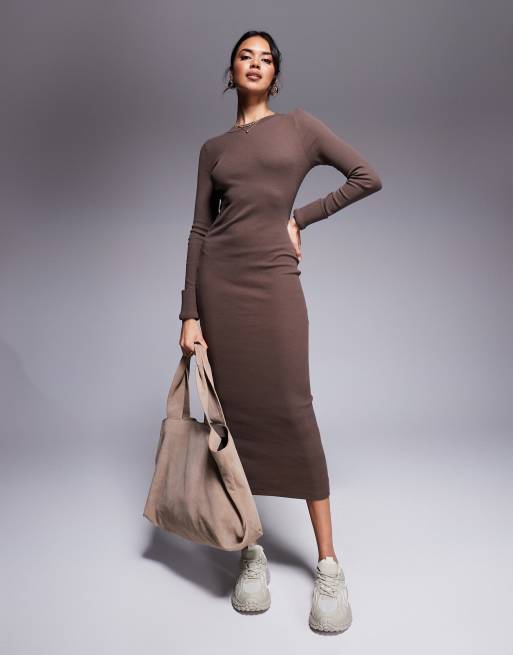 ASOS DESIGN – Chokladbrun, ribbad midiklänning med rund halsringning och uppvikta muddar