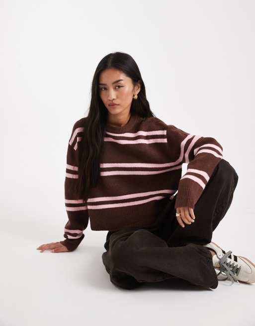 ASOS DESIGN – Chokladbrun, rosarandig och grov tröja med rund halsringning