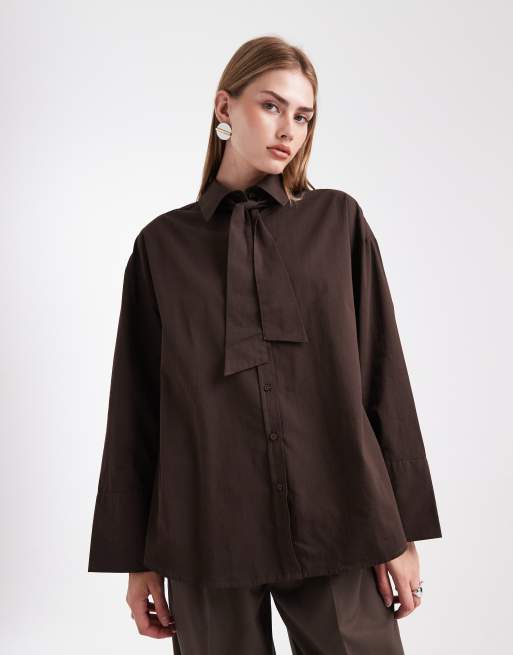 ASOS DESIGN – Chokladbrun skjorta i oversize med knytning vid halsen