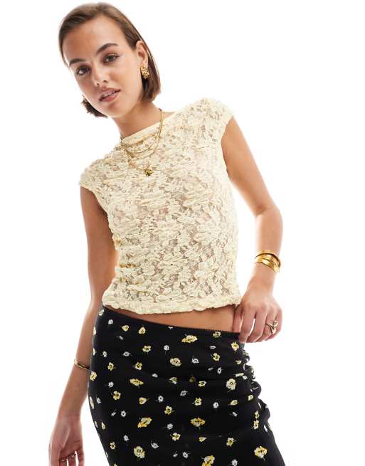 ASOS DESIGN – Citrongul, liten T-shirt i skir spets med båtringning