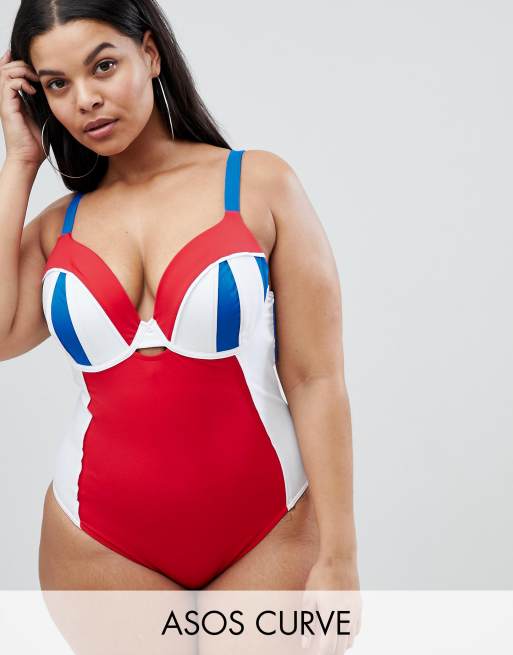 ASOS DESIGN – Curve – Blockfärgad baddräkt med kupor och byglar